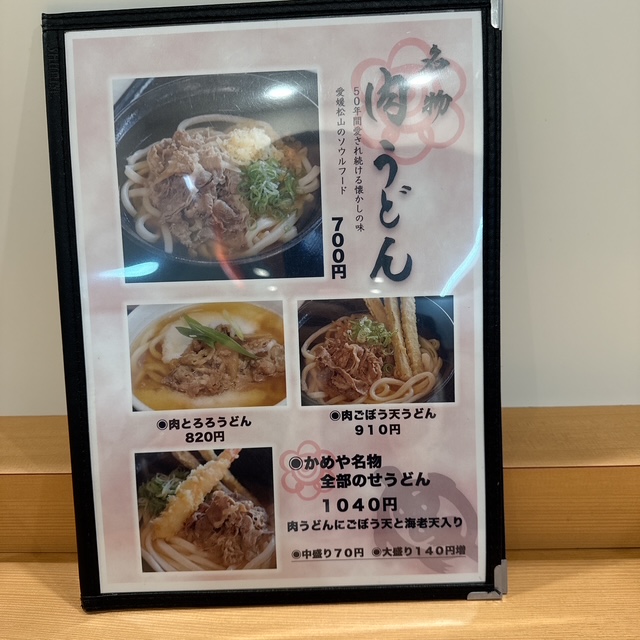 名物は肉うどんということなので、これにするのは決めてからメニューを見ます。他の人も肉うどんを頼んでいる人が大半です。50年間愛される松山のソウルフードと。そうなんだ。