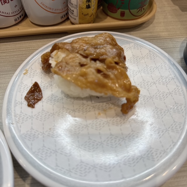 最後に食べる事が多いけど、牛カルビ寿司(176円)を頼んでみました。肉が取れている