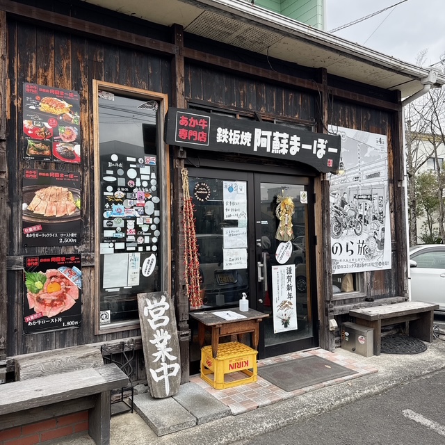 お正月4日に阿蘇神社に。参道のレストランは11:30を回ったあたりでも行列となっていて、結構時間がかかりそうでした。息子が赤牛のものを食べたいらしく、参道から少しそばにあるいつもライダーで賑わっているこちらのお店に来たところ、順番待ち1番目ということもありこちらに決定。鉄板焼き阿蘇まーぼーさんです。中華の麻婆の料理はないです。