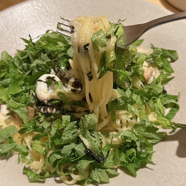 うま味調味料不使用の明太子と天然出汁を使った生パスタをたっぷりの大葉で覆います。これが日本の生パスタだと感じられるような優しい味わいです。