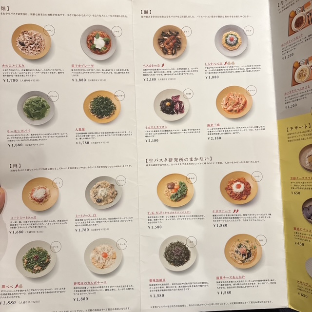 メニュー表も綺麗です。パスタの価格は1580円から2180円まで。1780円、1880円のメニューが多いので、パスタにしては高価格帯のお店ですね。