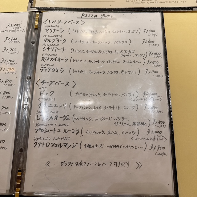ピザの価格は2000円前後くらいでした。ハーフアンドハーフが可能というのが素晴らしい。