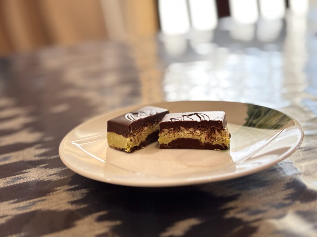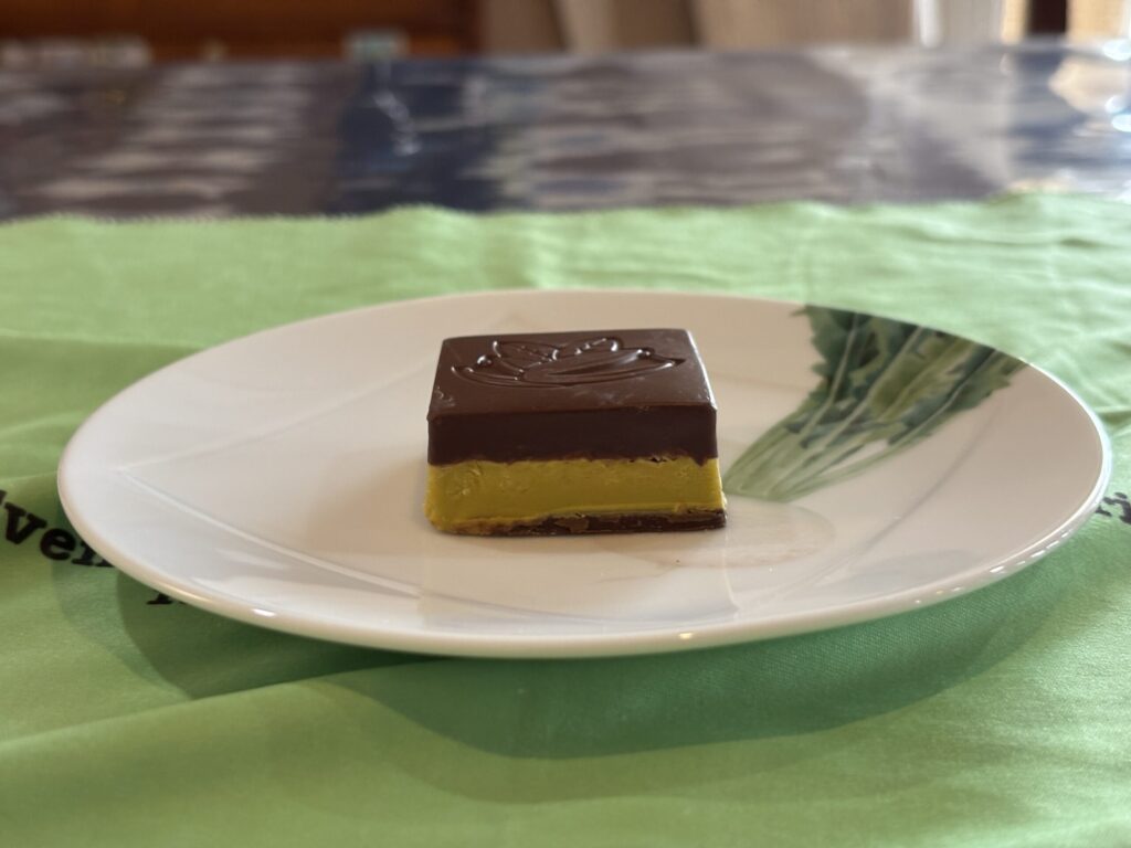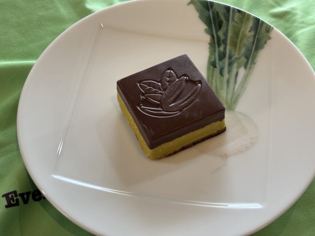 カダイフをピスタチオペーストと一緒にチョコで包み、外はざくざく、中はなめらかという、食感のコントラストがよいですね。