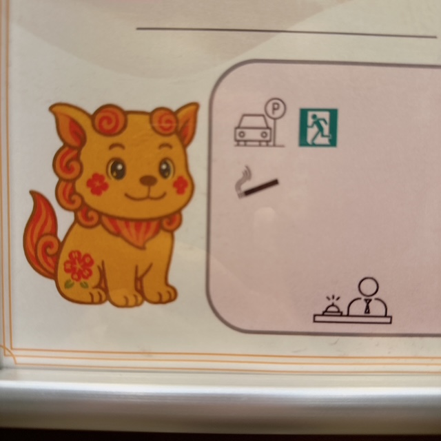 ホテルのエレベーターの中にある看板広告のシーサーがあまりにも可愛すぎる。獅子というよりまるで犬ですね