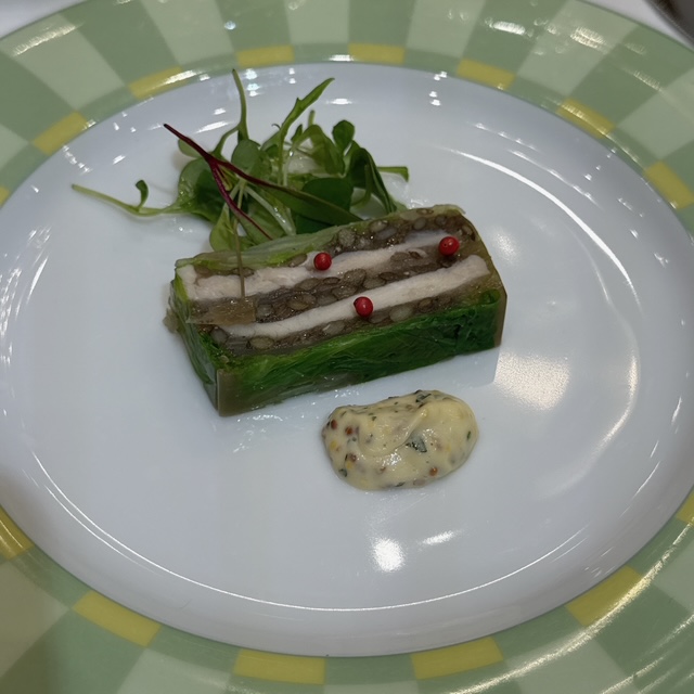 鶏肉 レンズ豆 白菜のテリーヌ仕立て マスタード風味のソース