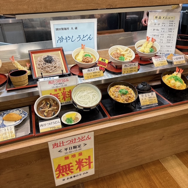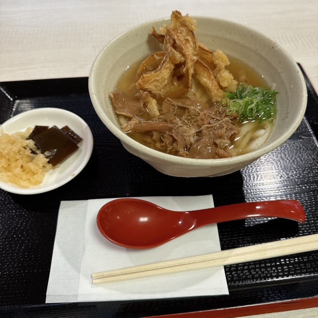 フードコートです。かけうどん 550円、そばは+100円。肉ごぼう天うどん 890円にします。
