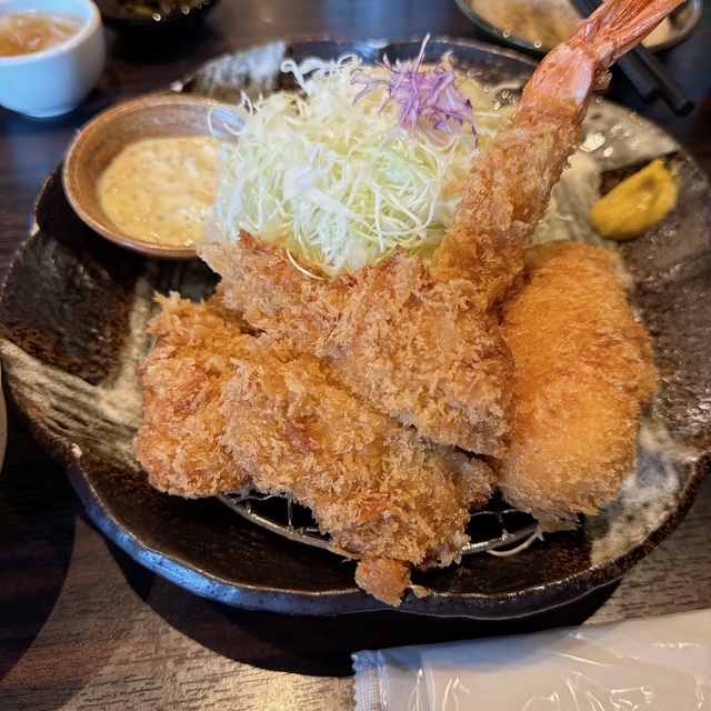 ここはメニューも豊富で色々とあるのですが、(メニューはホームページ見てくださいね。)今日はミックスフライ膳 2178円にします。ひれかつ2個、海老フライ、クリームコロッケの入ったモリモリなランチです。