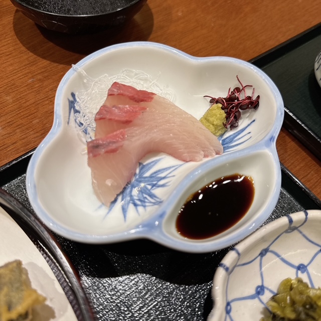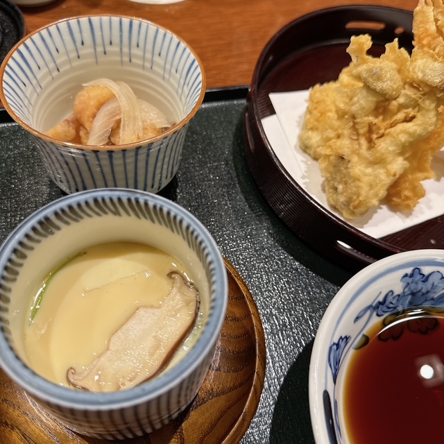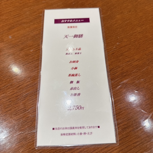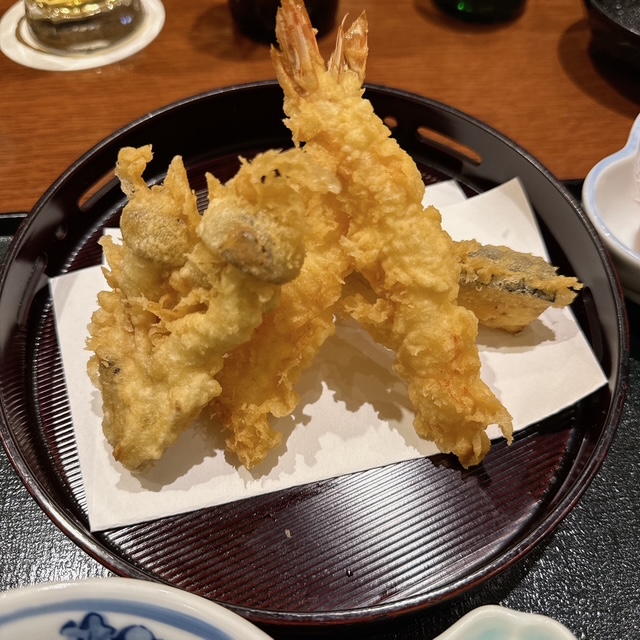 目の前で上げてくれるコース物もテーブルで出してくれますが、今日はセット物のおすすめメニューのこれにします。天ぷら5品(海老2、野菜3)に刺身、茶碗蒸しなどのセット 2750円のコース