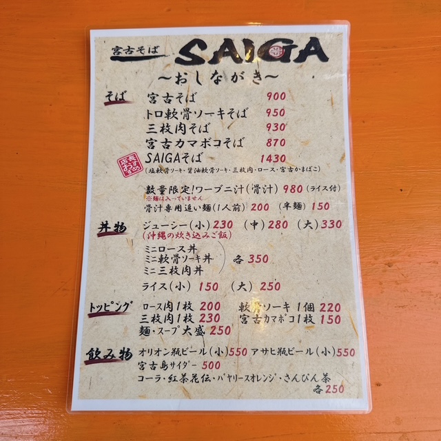 前回訪問時より宮古そば+40円になってました。全部入ったSAIGAそばは1430円。