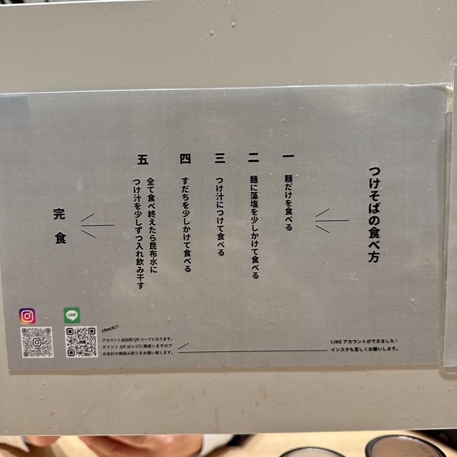富喜さんで初つけそばです。つけそばは 麺だけを食べて、藻塩をつけて食べる、つけ汁につけて食べる。この順でいきたいと思います。