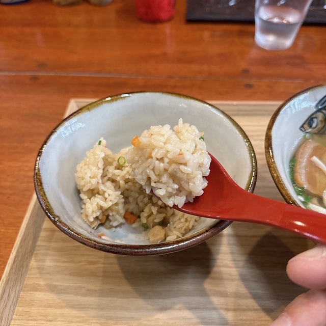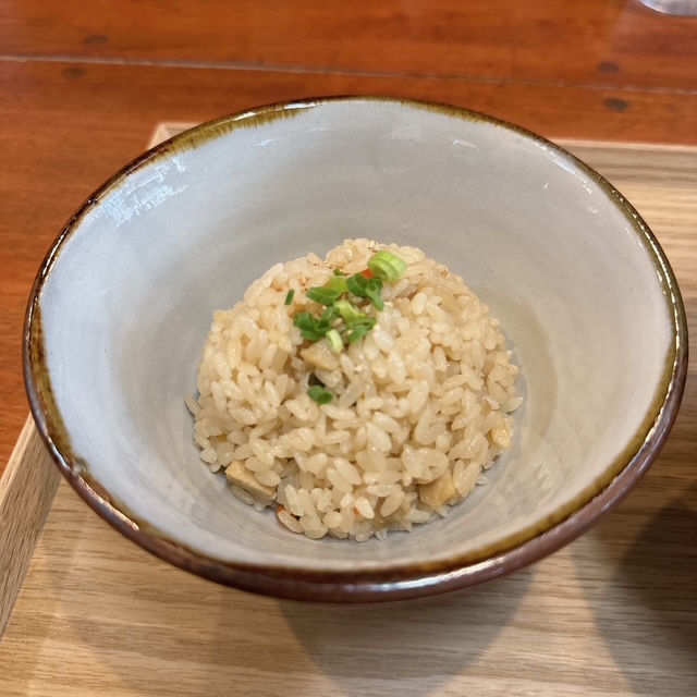 じゅーしぃはよくある茶色の醤油の色が効いていなく、鶏のだしが効いたこれも優しい味