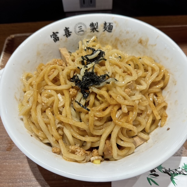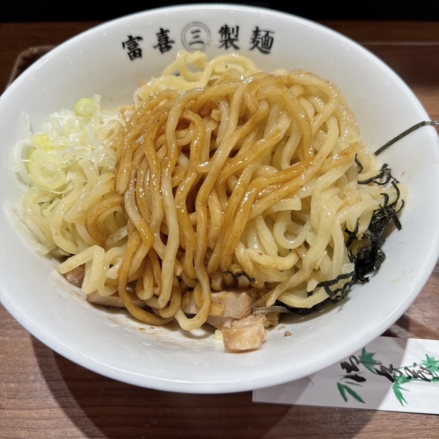 サクラマチでまぜそば 850円をいただきます。ビジュアル的には生卵入り950円がよいけれど、生卵の気分ではなかったので。中華そば、鶏そばは麺の量が少な目に感じますが、つけそばは多いわ。太麺だし