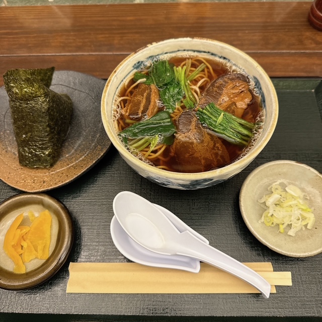 鶴屋7Fのやぶそば。やぶそばといえば花巻そば。雰囲気が沖縄そばのような日本そば。ここではこれが多いです。おにぎり1個付けて1150円。おにぎり2個が標準ですがさすがに多い。おにぎりと角煮を交互に食べるのも美味しい。