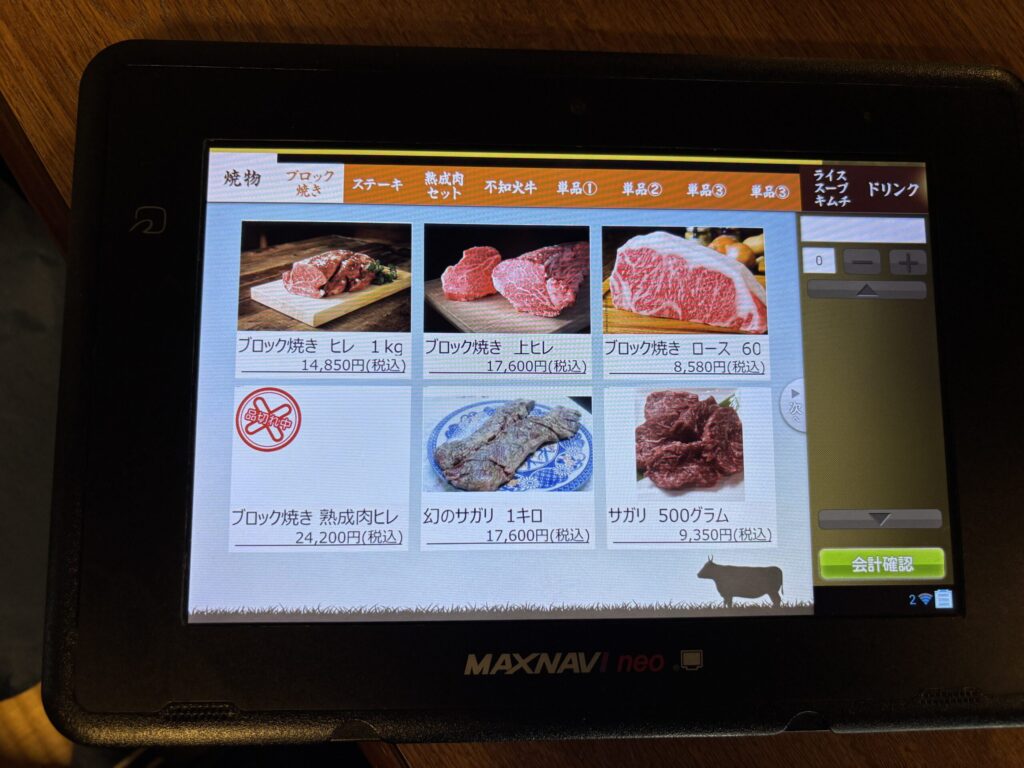 タブレットでブロック焼きヒレ1キログラムをオーダー。