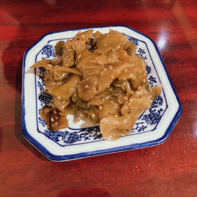 アグー豚使用なんですね。お通し 300円でザーサイ食べ放題