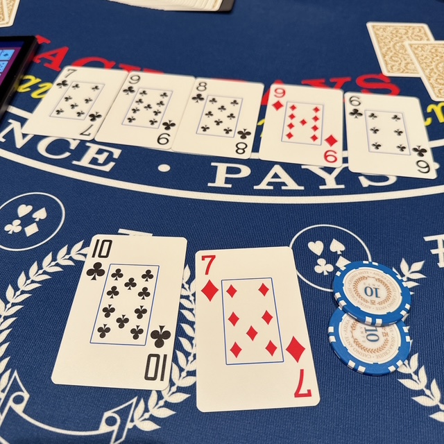ポーカーで出しました。ストレートフラッシュ。(数字が7から10まで、クローバー)ロイヤルストレートフラッシュ(10からAまで、同じ色)に次ぐ手です。なんと0.027%の確率らしい。最初の3枚でストレートが完成していたのですが、最後の一枚でストレートフラッシュに。007カジノロワイヤルでジェームスボンドが出して相手を負かした手と同じです。普通だったらFOLDの手かもしれません。