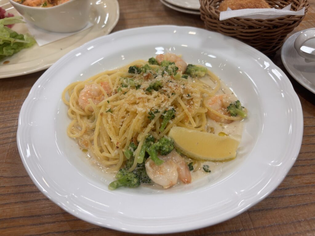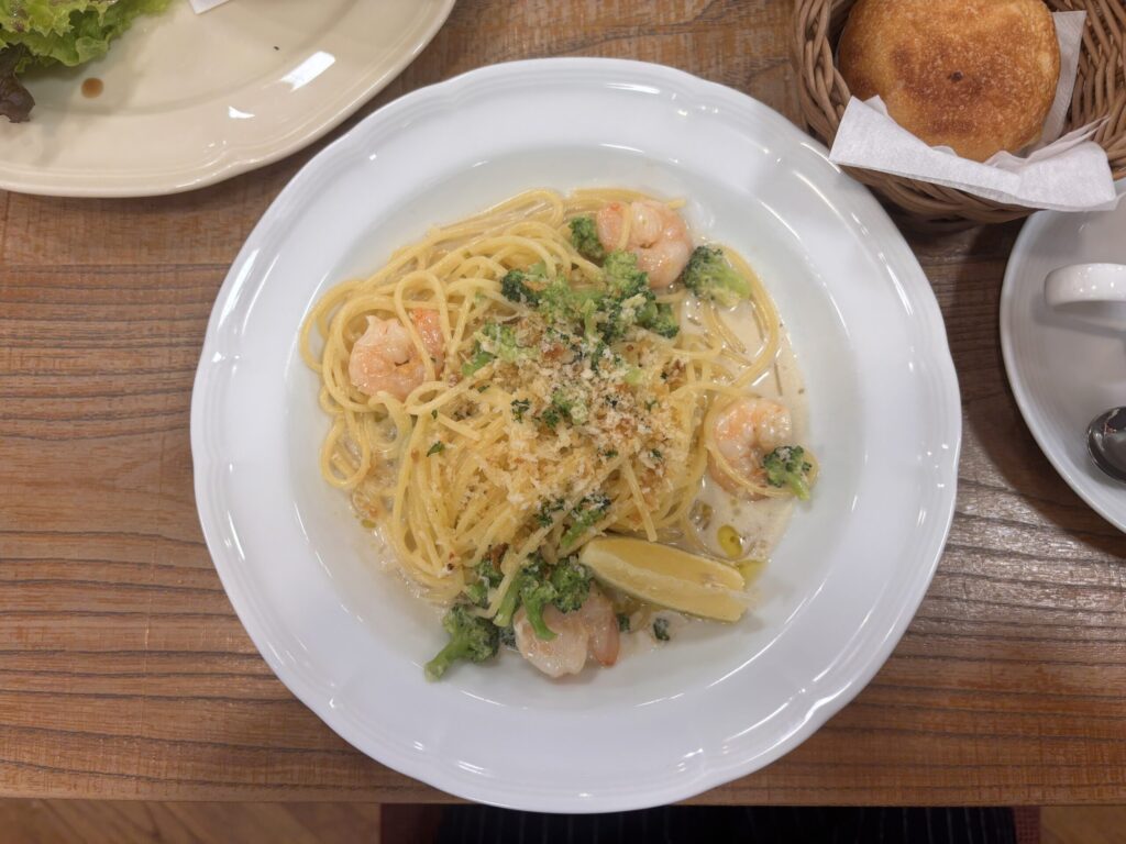 こちらは「エビとブロッコリーのアンチョビクリームソースパスタ」(パン付き)。