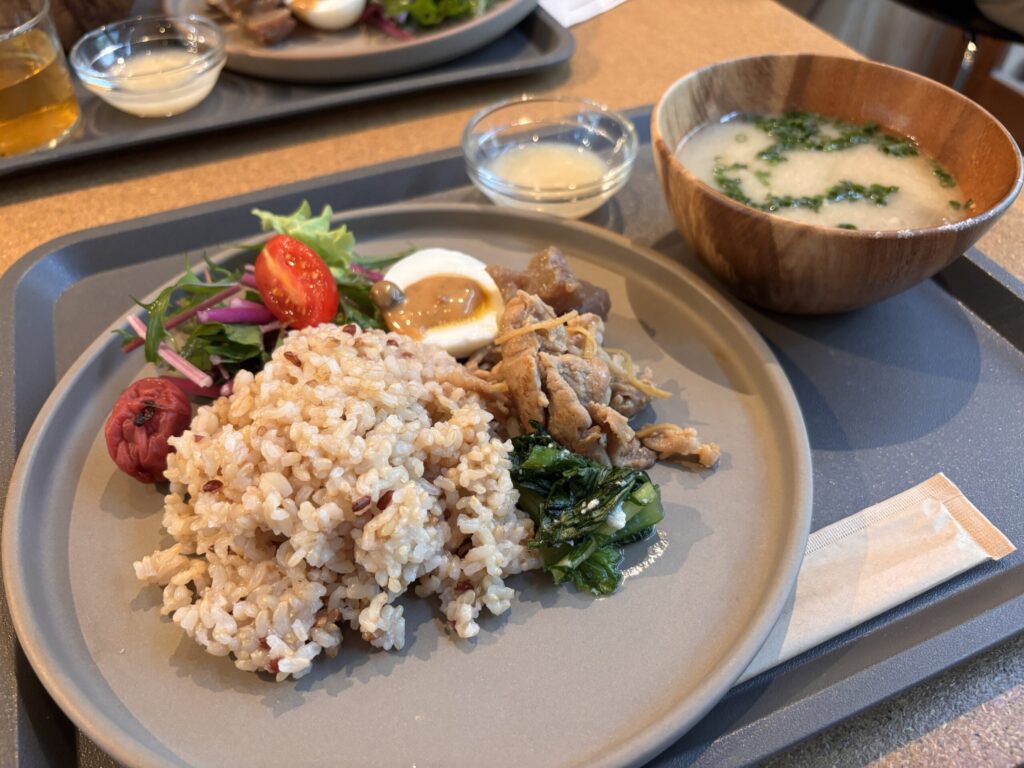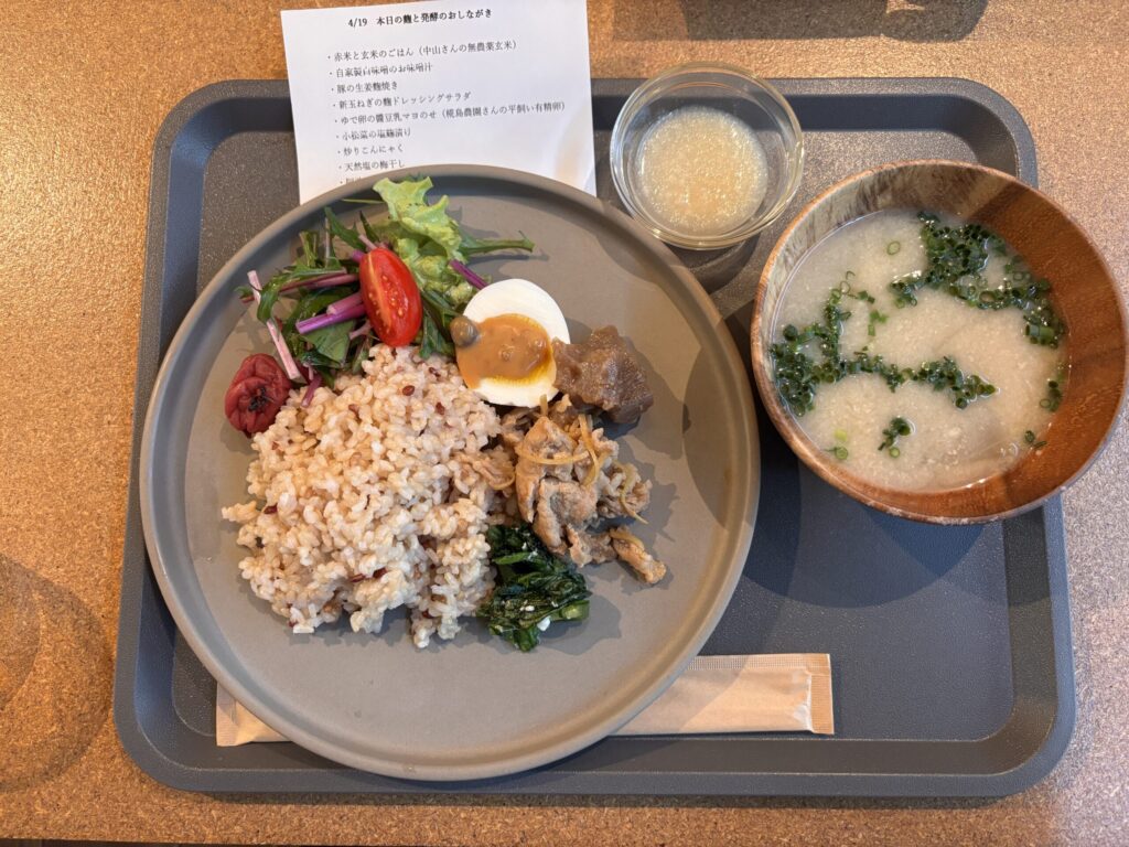 この日は赤米と玄米のご飯、自家製白みそのお味噌汁、豚の生姜麹焼き、新玉ねぎの麹ドレッシングサラダ、ゆで卵の工事豆乳マヨのせ、小松菜の塩こうじ漬け、炒りこんにゃく、天然塩の梅干し、そしてココナッツ甘酒。