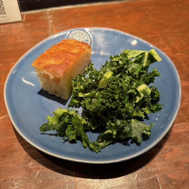 ケールのサラダとフォカッチャ。しかしケールを食べると口の中がもごもごになってしまう。