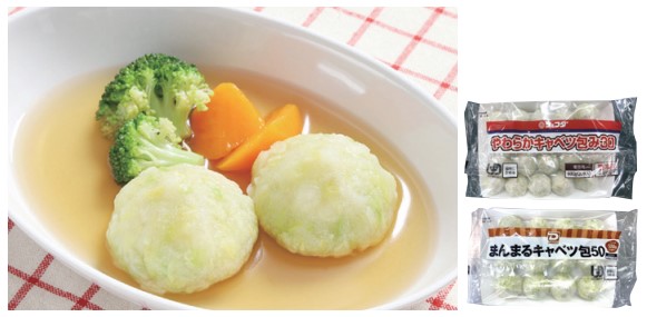 角切りのキャベツを外皮に使う事により繊維質が気にならず召し上がれます。トマト煮、クリーム煮またはおでんの具材としてお好みのスープや、煮汁にて調理してご使用ください。UDF:容易に噛める