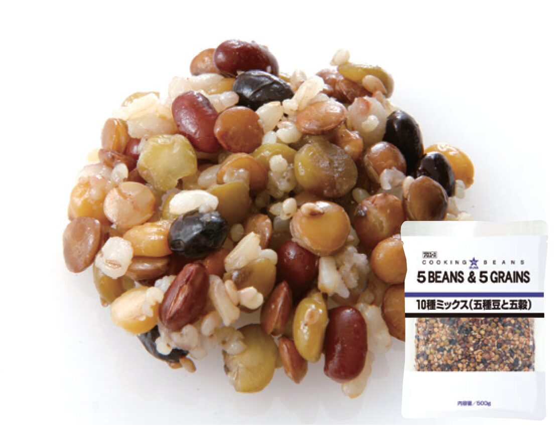 えんどう・ガルバンゾー・レンズ豆・黒大豆・あずきの五種豆と、押麦・もち玄麦・玄米・赤米・たかきびの五穀をミックスしました。サラダのトッピングやお料理の素材として、色々なメニューにご利用いただけます。