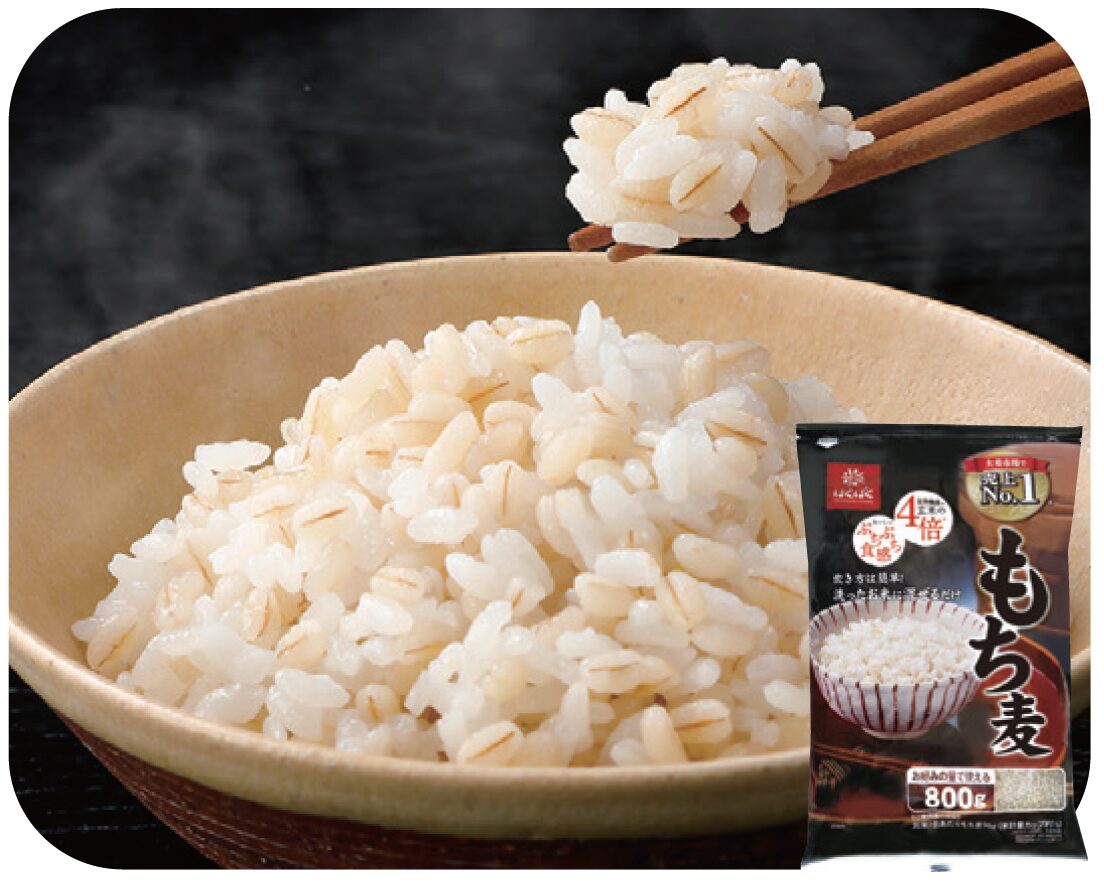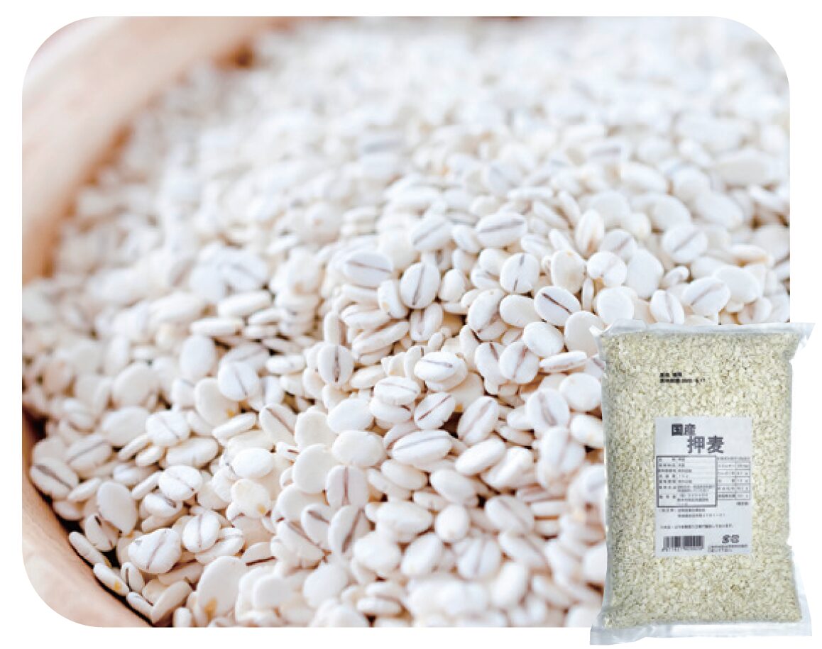国産大麦を精白し、蒸気で加熱後、ローラーで圧ぺんした麦です。昔から麦ごはんとして食べられており、ぷちぷちとした食感が特徴です。大麦は食物繊維が豊富に含まれており、便秘解消、、LDL コレステロールの低下、食後血糖値の上昇を抑えるなどの効果が期待できることから、近年注目されている食品です。