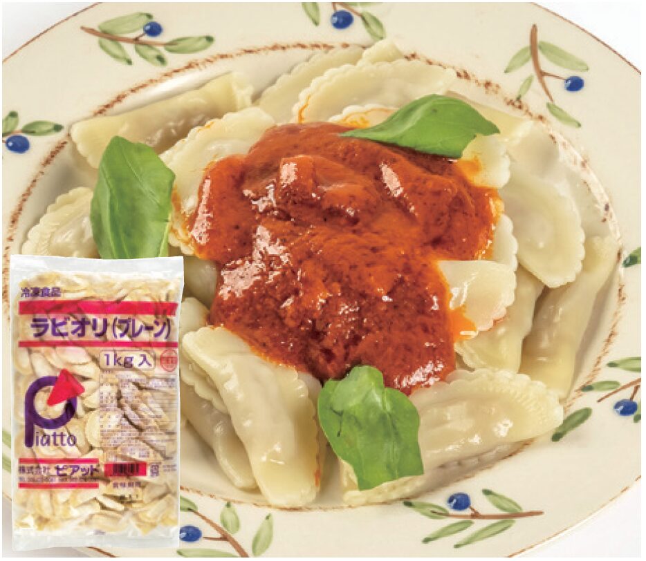 ピアットのラビオリは、安全安心の国産原料をもとに、大量調理しやすいよう1 個あたりの大きさが約3.6g と小さいサイズのラビオリに仕上げています。幅広いメニューでご使用いただけます。