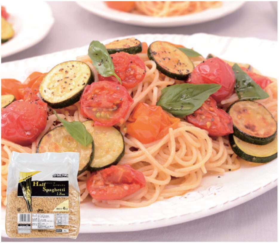 取り分けに便利なハーフサイズのスパゲティです。強力粉が配合されているので、モチモチとした食感です。惣菜や、お弁当のつけあわせ等、幅広くご利用できます。