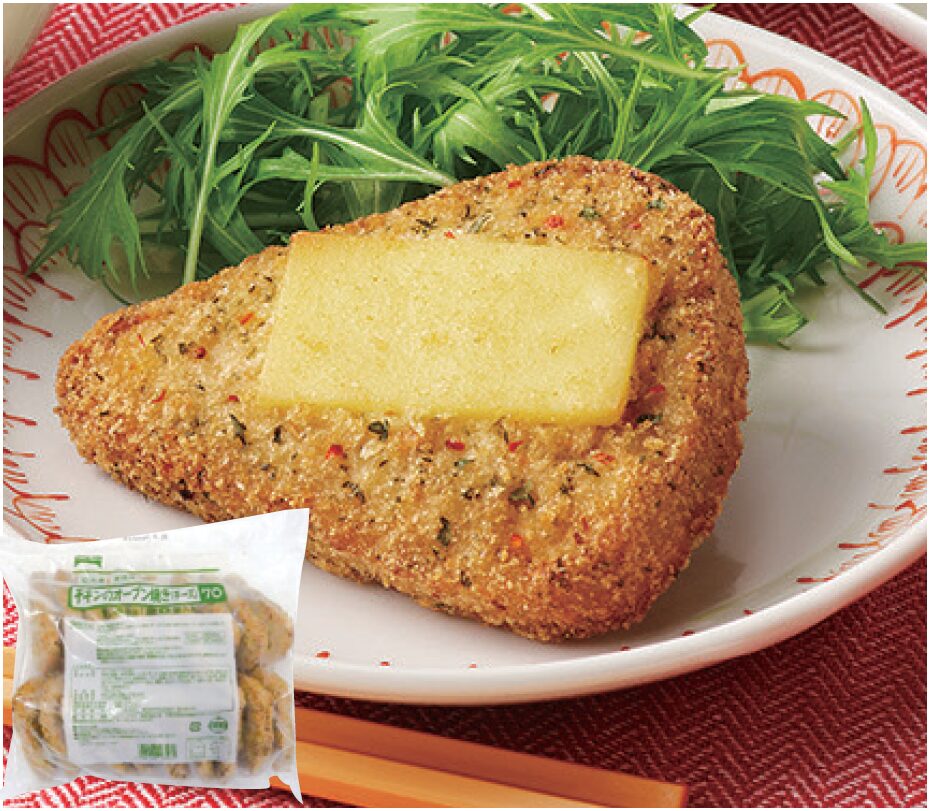 九州産の鶏むね肉に、彩りの良い赤ピーマンやパセリを混ぜたパン粉をまぶし、プロセスチーズをのせました。焼き色と食べやすさが特長です。