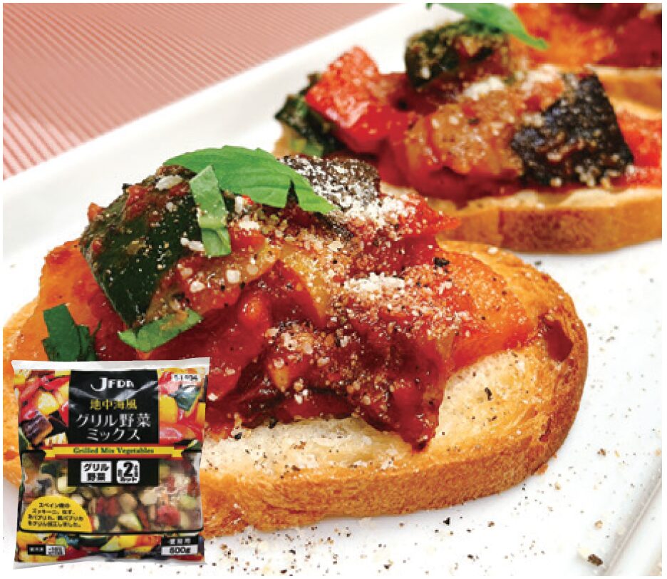 4種の地中海野菜(ズッキーニ30%、なす30%、赤パプリカ20%、黄パプリカ20%)をグリル加工し、使いやすい約2cmX2cm ダイスカットしました。