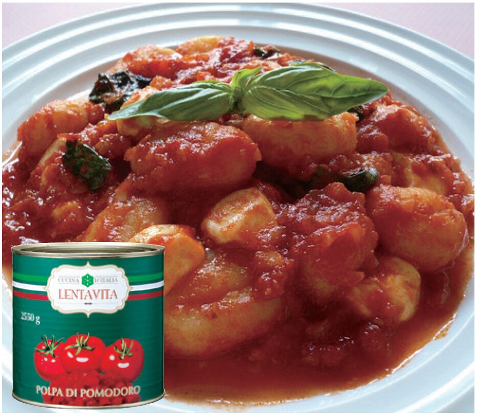 完熟したイタリア産トマトを調理しやすいダイス状にカット。トマト本来のフレッシュさと、甘味と酸味のバランスがとれた味わいが特徴です。