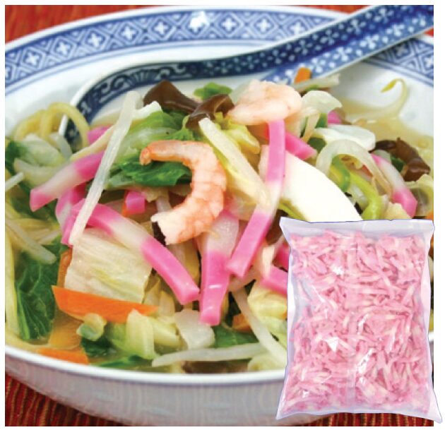 紅白の蒲鉾を約5mm 角に棒状にカットしてIQF( バラ凍結) しています。切る手間が省けて必要な量をお使いいただけます。長さ約4.5cm