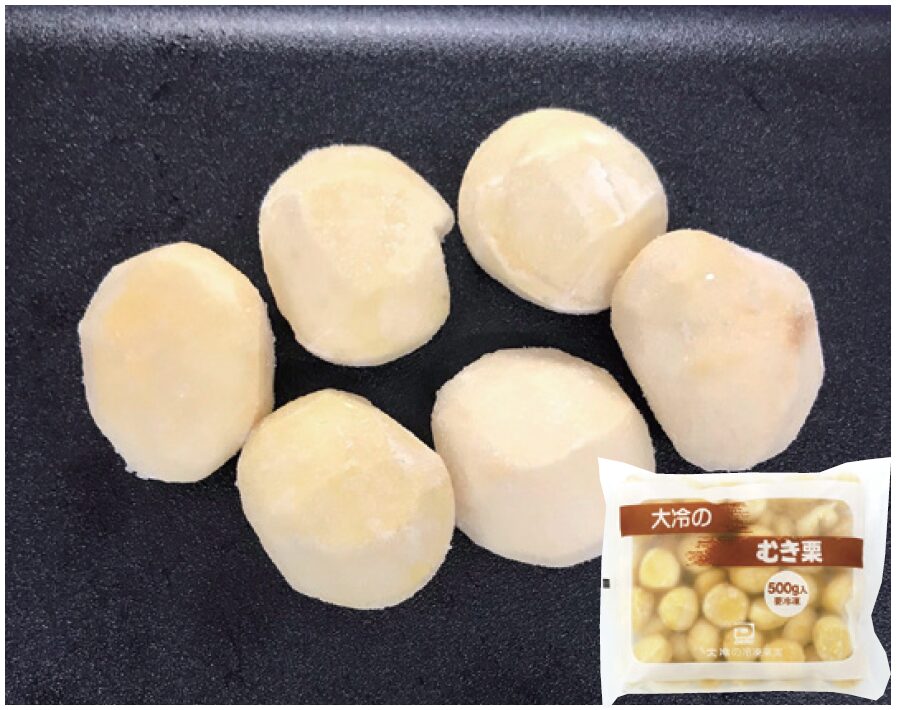 粒よりのむき栗を揃えました。料理からお菓子まで幅広い用途にお使いいただけます。凍ったまま必要な分だけ取り出し、お湯で湯通ししてから調理してお召し上がり下さい。栗ごはん、栗ぜんざい、甘露煮などにご使用いただけます。