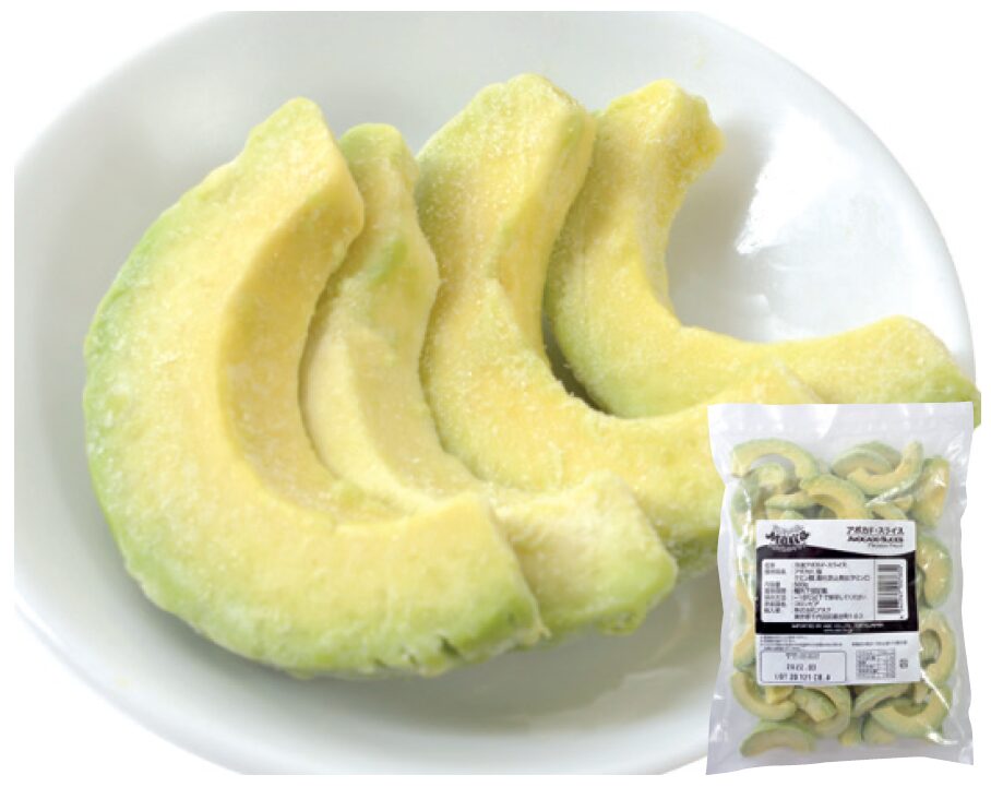 アボカドの皮と種を取り、櫛形にスライスしました。冷凍品ですので、使用する分だけ取り出せ、ロスなくお使い頂けます。1 袋当たりの目安量:約70 ~ 130 枚