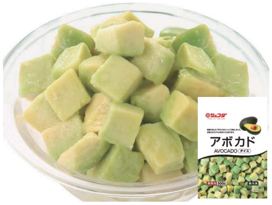 適度に熟したアボカドをカットして凍結しました。濃厚な味わいが特徴の冷凍アボカドダイスです。必要な分だけそのままスグに使えます。カットサイズ:15mm、1 個:2-3g(目安)、約220 ± 30個/P(目安)