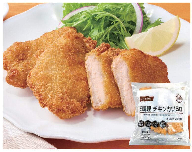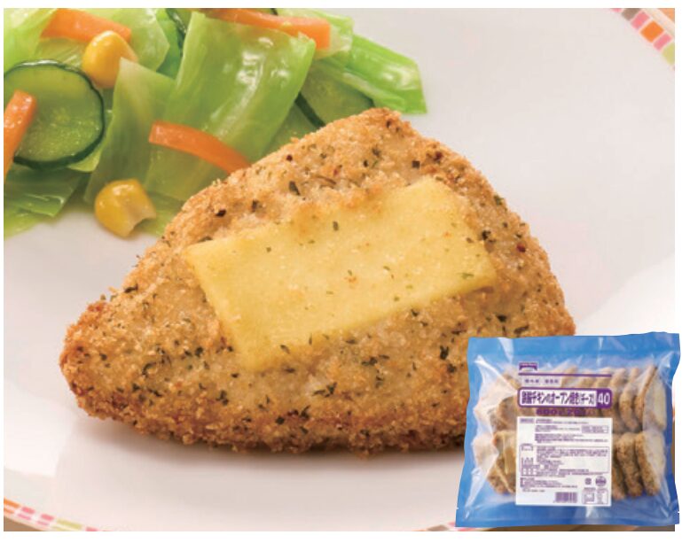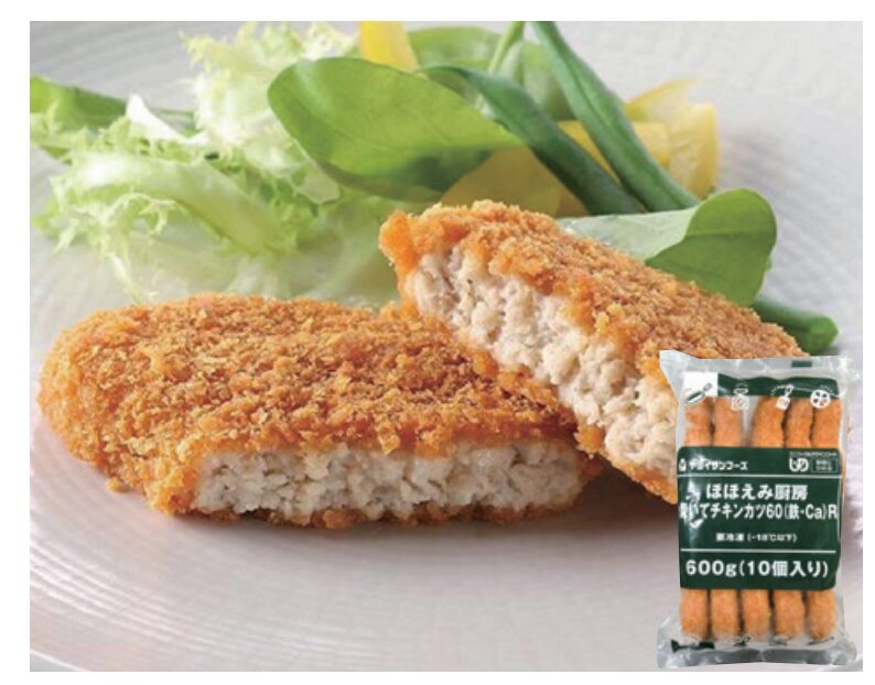 粗挽きした鶏肉に下味をつけてジューシーに仕上げた、焼き調理専用のチキンカツです。自社独自の技術で、フライヤーを使わずに油で揚げたような見た目とサクッとした衣の食感を実現しました。1個当たり鉄 3.5mg、Ca114mg。UDF区分:容易にかめる