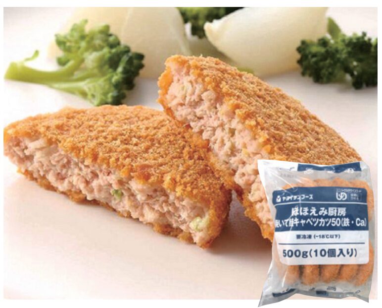 オーブンやスチームコンベクションでの焼き調理専用の鮭キャベツカツです。自社独自の技術で、フライヤーを使わずに油で揚げたような見た目とサクッとした衣の食感を実現しました。1 個当たり鉄1.1mg、Ca93mg。UDF 区分:容易にかめる