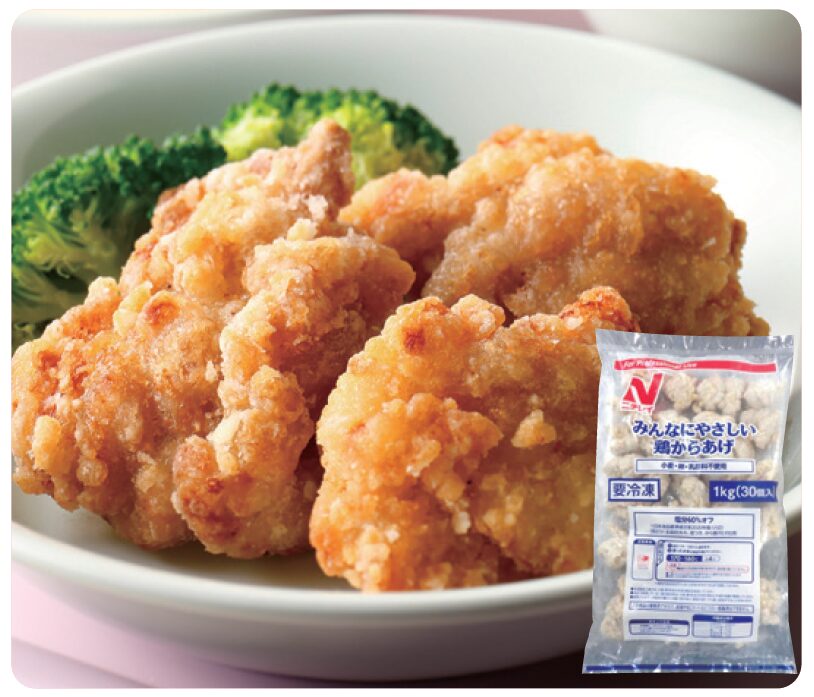 小麦原料・卵原料・乳原料を使用していない鶏もも肉の唐揚げです。食塩相当量を100g あたり0.8g以下に設計。塩こうじを使用することで、しっとりジューシーな仕上がりにしております。