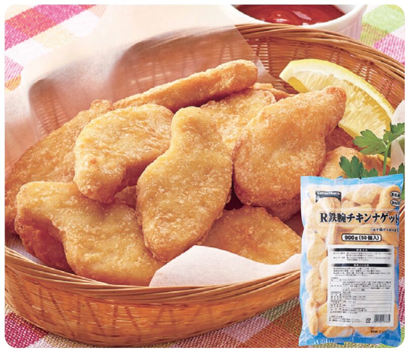 国産鶏ムネ肉を使い、おからを配合してソフトに仕上げたチキンナゲット。卵・乳不使用で、鉄分・カルシウムを強化。プレフライ済で焼き調理にも対応しています。1 個/18g 50 個入り。鉄1.3mg/個、Ca77mg/ 個。リニューアルにより100g 当たりの食塩相当量が1.6g ⇒ 1.3g となりました。