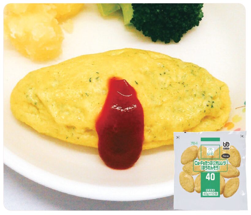 カルシウム・鉄がたっぷり入った、ふんわり食感のオムレツです。ほうれん草を加えて彩りよく焼き上げました。UDF: 容易にかめる【40】Ca95.6g/ 個、鉄1.8mg/ 個【60】Ca143.4mg/ 個、鉄2.7mg/ 個