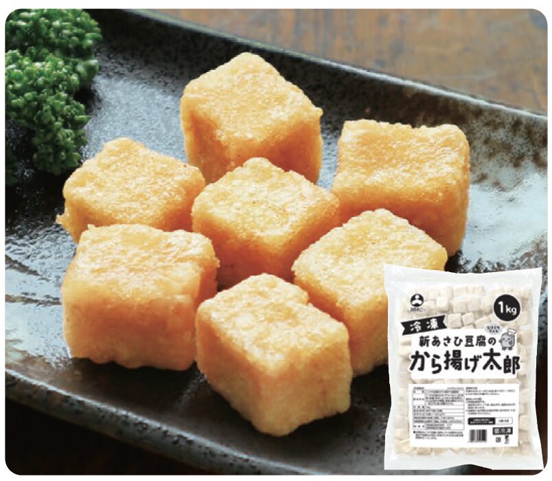 栄養豊富で減塩製法の「新あさひ豆腐」を使用したから揚げです。油跳ね・油汚れしにくいから油調がしやすい!冷めてもサクサク!米粉使用のこだわりの衣を使用。醤油ベースの味で使いやすく、アレンジも可能!1 袋当たり入数:約160個、1 個当たりサイズ目安:18X18X23mm