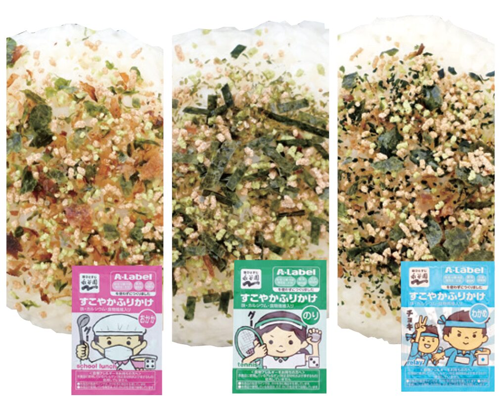「くるみ・小麦・そば・卵・乳・落花生・大豆」不使用、「香料・着色料」無添加の商品ブランド「A-Label」の業務用ふりかけです。育ち盛りのお子様にうれしい鉄、カルシウム、食物繊維入りです。お子様が楽しめる6種類のデザインを用意しました。
