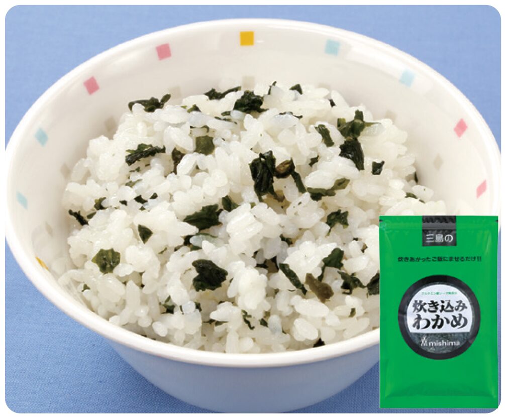 混ぜ込み用のわかめごはんの素です。あたたかいごはんに混ぜるだけで、手軽に酸の風味豊かな“ わかめごはん” が出来上がります。米6-7.5kg に1P