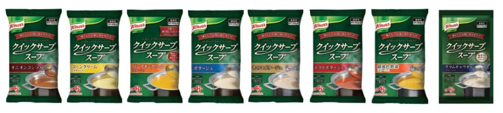 クイックサーブスープ オニオンコンソメ・コーンクリーム[ポタージュ]・パンプキンクリーム[ポタージュ]・ポタージュ・きのこポタージュ・トマトポタージュ・緑黄色野菜[ポタージュ]・クラムチャウダー[ポタージュ]