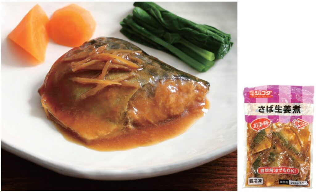 骨を丁寧に取り除いたさばにかつおの旨味を加えた醤油ベースのタレに千切生姜を使い、バランスの良い煮魚に仕上げました。