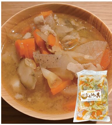 無漂白の皮付ごほうを使用しており、豚汁特有のごぼうの香りがします。開封時のご使用時には、具材を水洗いする必要がなく、充填液も一緒にご使用ください。野菜の風味が豚汁の風味を引き立てます。