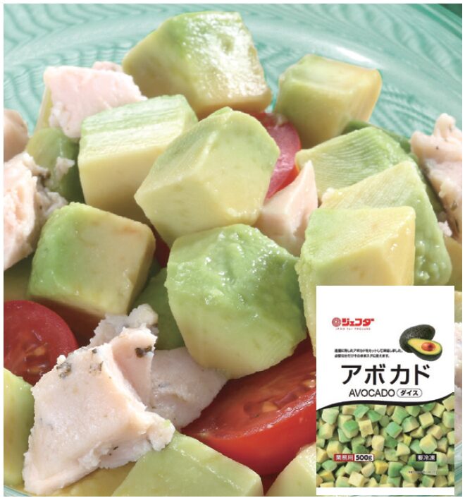 適度に熟したアボカドをカットして凍結しました。濃厚な味わいが特徴の冷凍アボカドダイスです。必要な分だけそのままスグに使えます。カットサイズ:15mm、1 個:2-3g(目安)、約220 ± 30 個/P(目安)