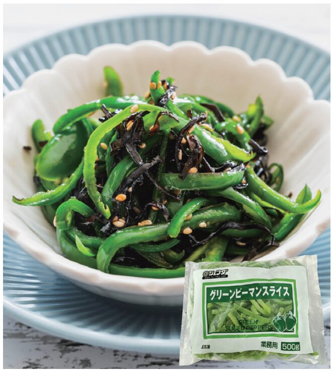 新鮮な青ピーマンをブランチング後、スライスカットし急速凍結しました。IQF 凍結のため、使用したい分量のみ使用できます。スライスカットして製品にしているため、下準備の手間を省くことができます。幅:5-7mm