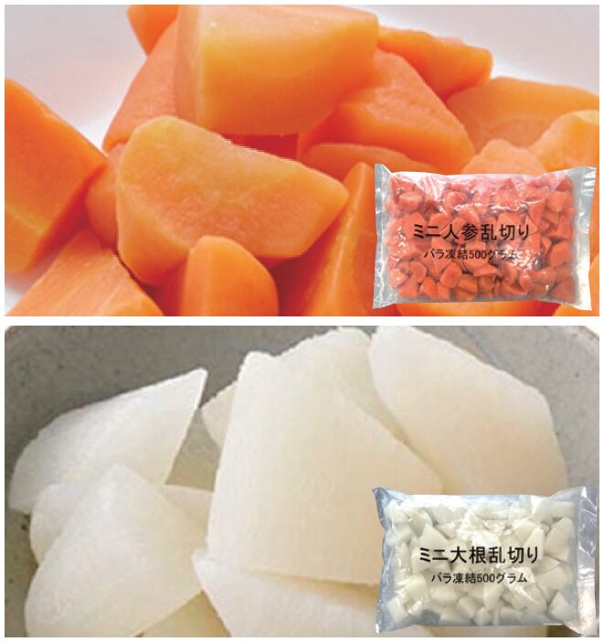 旬の時期に収穫し、加工、急速凍結したものです。煮物等にご使用いただけます。【人参】重さ:3-5g/個(目安)【大根】重さ:6-8g/ 個(目安)
