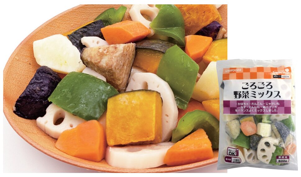 かぼちゃ・れんこん・じゃがいも・なす・にんじん・緑パプリカをバランスよくミックスしました。れんこん(スライスハーフ)12 個、かぼちゃ(乱切り)6個、じゃがいも(乱切り)6 個、揚げなす(乱切り)6 個、緑パプリカ(乱切り)6 個、にんじん(乱切り)6 個以上